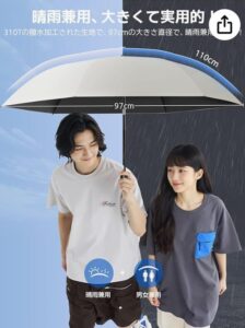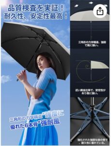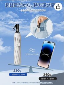 晴れの日も雨の日も使える晴雨兼用タイプで、超軽量・折りたたみ・耐風設計・撥水加工済みと、まさに最先端の多機能日傘です。