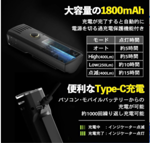 | 自動点灯センサー搭載 | フル充電に少し時間がかかる |