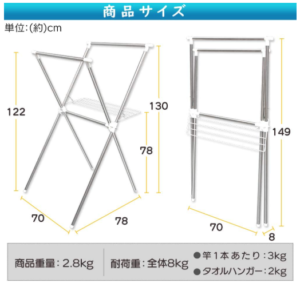 | その他機能 | タオルハンガー付き、ふとん対応、折りたたみ可能、工具不要で組み立て簡単 |