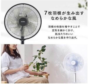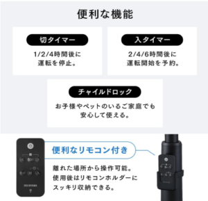 本製品はフルリモコン式なので、風量調整・首振り・タイマー設定などすべての操作が手元で完結します。いちいち立ち上がる必要がないので、特にリビングや寝室で重宝します。