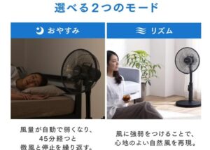 自然な風の強弱を再現する「リズム風」や、就寝時に便利な「おやすみモード」も搭載。これで夜間の冷えすぎも防げます。