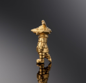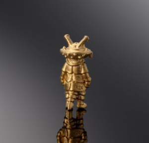 その独特なフォルムと、どこか憎めない表情が精緻な造形と純金の質感で見事に再現されています。